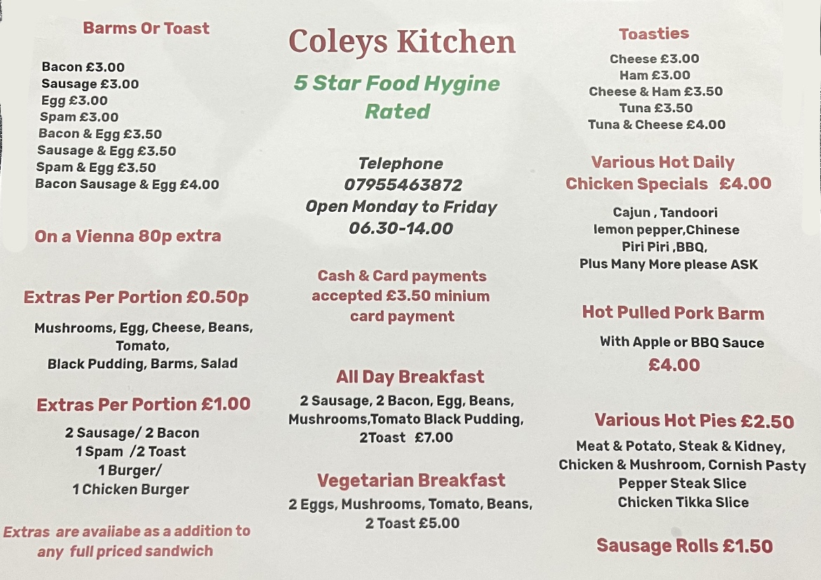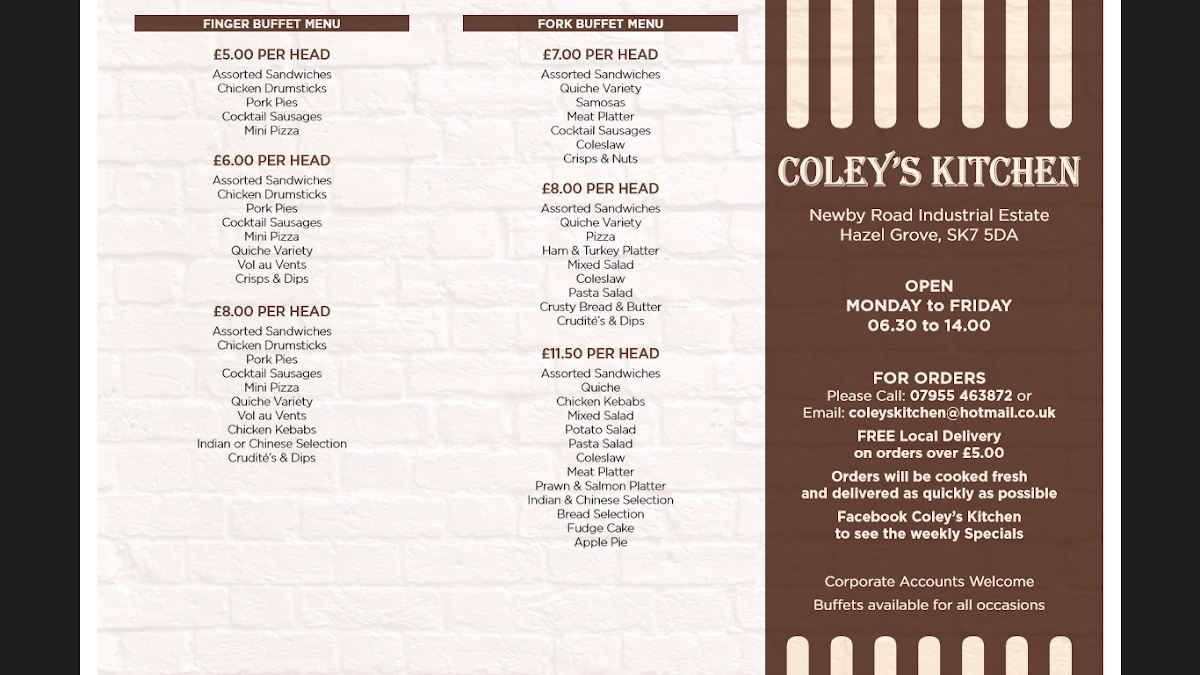 Welcome to Coley's Kitchen, a charming cafe nestled in the Newby Road Industrial Estate, Hazel Grove. This culinary gem is dedicated to satisfying your cravings, whether you're after a hearty breakfast or a delightful lunch. The menu features a variety of comfort foods, where every dish shines with quality and flavor.